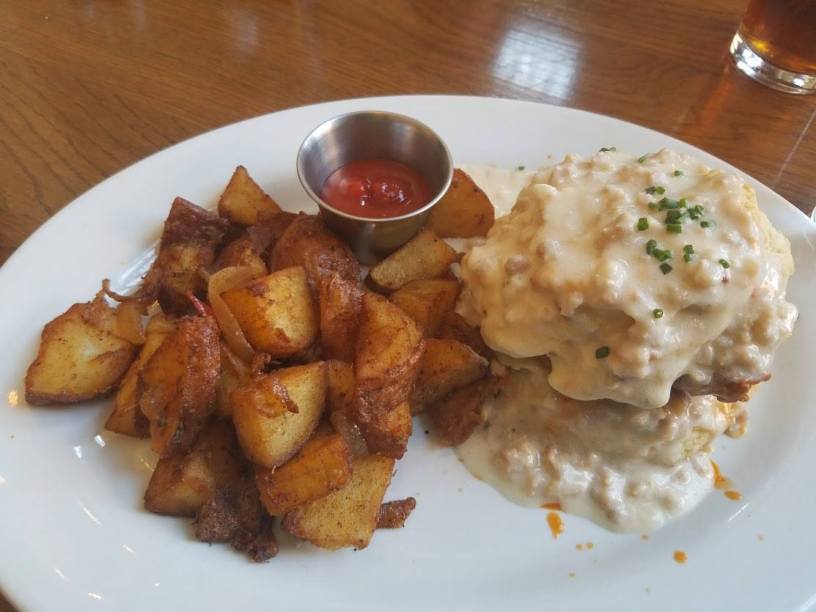 Buffalo Chicken & Biscuits, Sausage Gravy, Potatoes : My son and I both ordered this dish. The ingredients by themselves were not extraordinary .. nothing Bob Evans or Cracker Barrel could not have done as well. It was the pairing of a buffalo sauced fried chicken breast with the biscuits and gravy that made for a unique and pleasurable combo of flavors. It was also quite filling. Potatoes were AWESOME big hunks of home fried goodness.