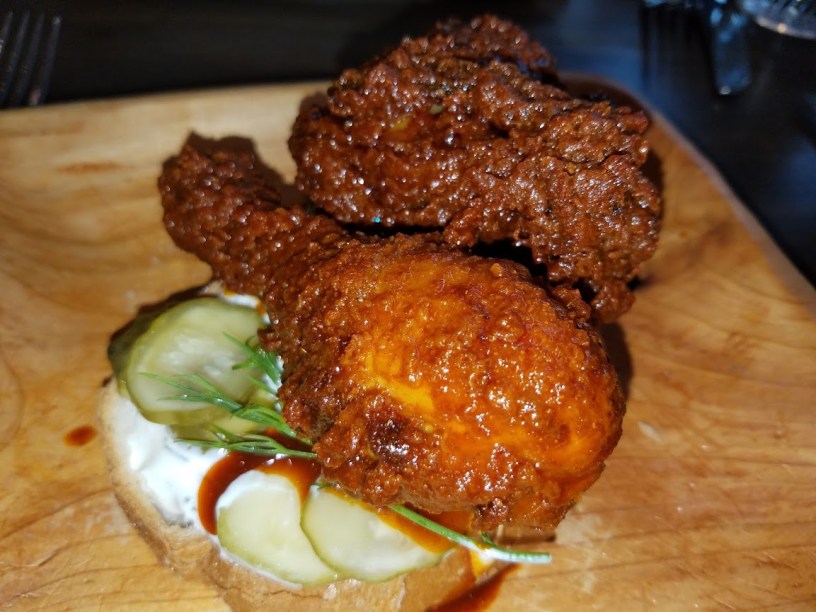 Sbraga’s take on the classic Nashville Hot Chicken recipe has been touted as the “best fried chicken” in Philadelphia. We happened to be in King of Prussia today, so I thought it time to verify the claim. There is no separate lunch / dinner menu so this dish clocked in at a hefty $16 with no sides (save for a hunk of un-toasted white bread with some ranch dressing and a few tiny dill pickle slices (as tradition dictates.)) The wife ordered a pulled pork sandwich, which came with excellent sweet potato fries) at $11. She got the better deal.