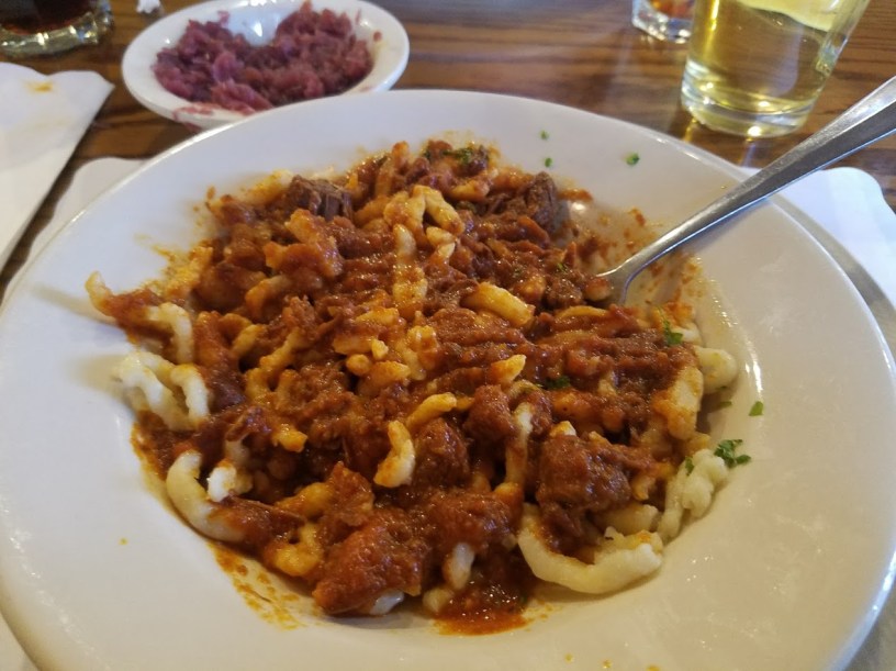 I went for an ancestral favorite, Hungarian Goulash, served over superb tender spaetzle with sweet and vinegary red cabbage on the side. My wife had a pair of subtly seasoned veal sausages (bratwurst) that were not at all garlicky as the pork versions often are. Her sides were very good sauerkraut and creamy homemade mashed potatoes. Each of our meals was about $10.00