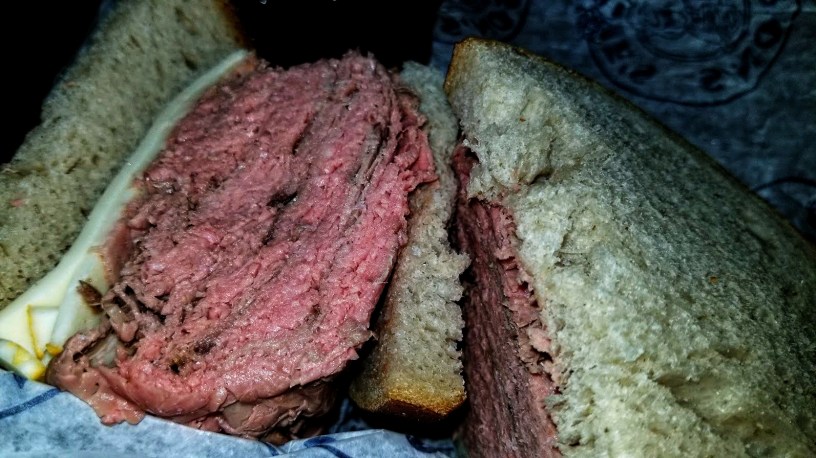 The wife was feeling flu-ish, and is not a huge fan of matzoh-ball soup, so I got her a bowl of mish-mash chicken broth with rice, bowties and a kreplach. I’m not a big fan of soup for lunch (except Pho) so I went for a roast beef and Muenster. Not a cheap sammie at $12, but nobody can say Hymie’s skimps. Nice and rare, freshly sliced. They make a hell of a deli sandwich.