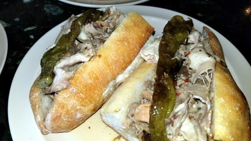I’ll start with the pork… Expertly seasoned, with the initial hit of sage – the hallmark of any S. Philly grandmother with more vowels than consonants in her name. There was just enough broth to moisten the pork .. a little pool on the plate, but not enough to soak through the substantial unseeded roll. Provolone was sharp enough, and the long hots had a good bite without overpowering the meat. Among the best roast pork I’ve sampled, but not a match for a Paesano’s Arista on Carangi with it’s crunchy bits scattered throughout.