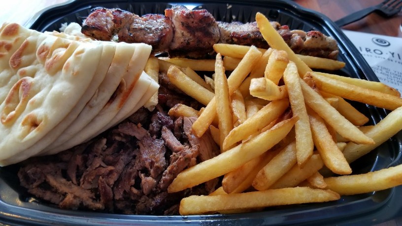 I went with the plate. Fries were decent, frozen shoestring variety, served unsalted. Salad was fresh and tasty. The mound of meat was HUGE. I did order a pork skewer (available for $3 as an add-on to a plate.)