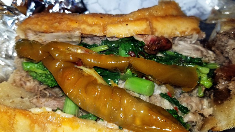 My dining companion, Azi ordered the Arista – Suckling pig with sharp Provolone, long hots and broccoli rabe. We went “halfies” so each of us could fully enjoy the lusciousness of each which “hunks” just would not have accomplished. I’ve had versions with crispier “crispy bits” but this was leagues above the typical version which is as much braised as roasted. Mixed light and dark meat with an au jus that was not overpoweringly garlicky as is often the case. The broccoli rabe added a bitterness that cut the richness of the pork. Long hots added flavor as well as a tongue-tingling burn and the moderately dense, chewy Carangi roll held its own against the juice. The extra-sharp Provolone tied everything together until the last bite. There is a reason a stack of several dozen large paper napkins graces each table. $9.00 is a bargain.