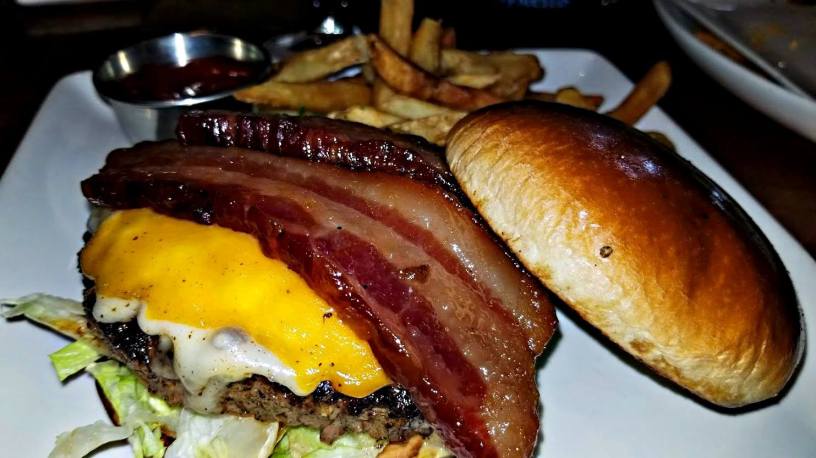 Burgers are half pound, fresh brisket short rib blend (pub variety) served with olive oil parsley fries or side salad. I tried the fries. They tasted, unsurprisingly, like fries. The $16 Bacon Cheeseburger featured house smoked candied thick cut bacon, aged Vermont white and yellow cheddar cheeses, shredded iceberg, vine-ripened tomato, red onion on a toasted brioche bun. It tasted (unsurprisingly) like a bacon cheeseburger.