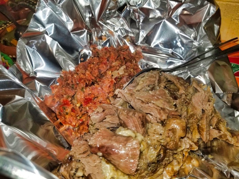 I discovered that I was more readily able to converse in my pathetic Spanish than interpret the friendly woman’s accent in English. It appears, one orders at the door (a station was set up where the proteins are chopped and weighed, and handed out. Takeout customers paid right then and there, while dine-in customers are handed a half kilo of steaming meat in a basket, and left to panic until one of the staff finds a seat for you. There are tables for groups of five or six, while couples mingle shoulder to shoulder with strangers at counters along the wall.