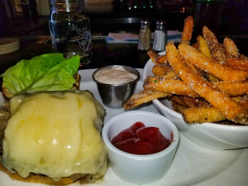 Though I entered as an anonymous nobody, I was cordially greeted and treated by Lynn. I had initially intended to try a low-risk short rib pizza or sandwich, but after having properly introduced myself, Lynn heartily recommended I try the burger. So I did. It was an EXTRAORDINARY hunk of Prime ground mixture (not sure of the pedigree of cuts) that melted in my mouth, cooked to medium rare perfection.) Served with a remoulade and a ramekin of ketchup (for the crispy Parmesan encrusted fries … and you know a ramekin is a sign of quality .. ) it easily ends up in the top three burgers I could name in the area based on beef quality and execution.