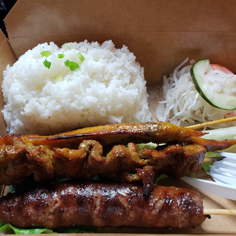 Cambodian skewers and bao buns at Khmer Grill and Bao Bar. Way inexpensive noshes, and very reasonable beer and cocktails everywhere.. incredible variety.. open until 2:00 AM. Right next to Dim Sum Garden and the hand-drawn noodle place, it takes some will power to make the extra few steps. Very good eats. The beef skewer was tough (un-tenderized round steak) but marinades were unique and delicious. Whole stretched chicken wing was superb, as was the sausage. These are grilld over REAL charcoal. Every one of the bao were indescribably succulent. I’m looking forward to trying them all. I could spend an afternoon here easily.