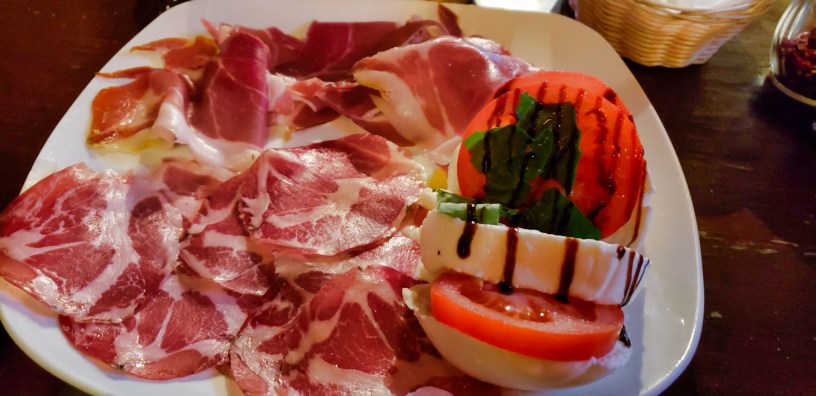 The food is INCREDIBLE, fresh, homemade, and expertly prepared. Our first appetizer was the “Taste of Home” antipasto comprised of Speck, Prosciutto di Parma, Capicolla and a Caprese salad with homemade fresh buffalo Mozz. This apparently changes depending on what is on hand. We also shared (3-people) an order of homemade (actually EVERYTHING is homemade) lobster ravioli in a cream sauce, each accompanied by a perfectly plump and juicy shrimp.